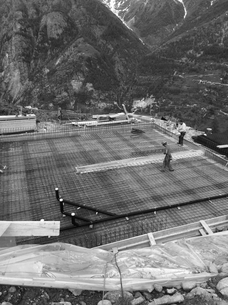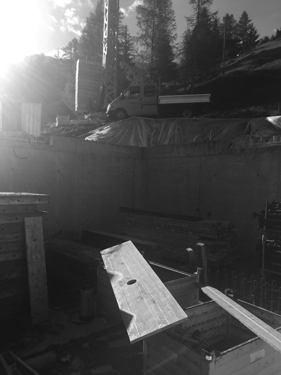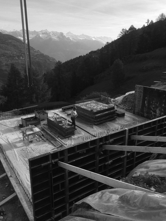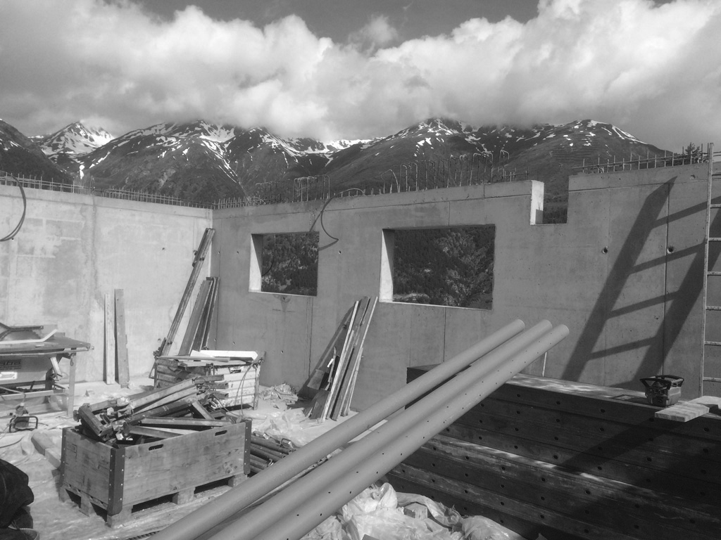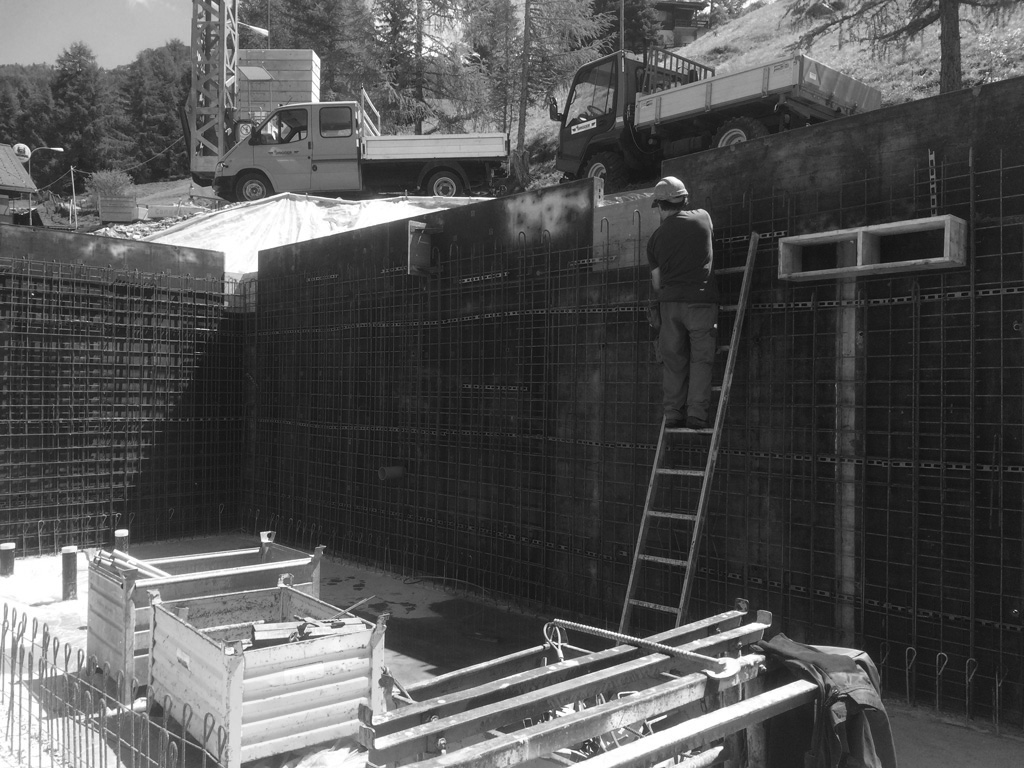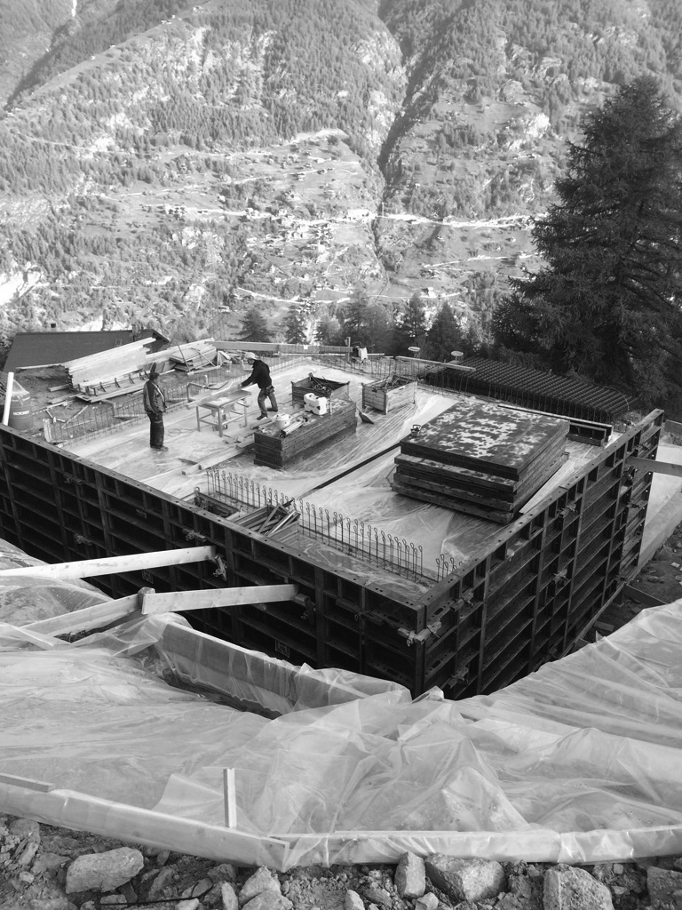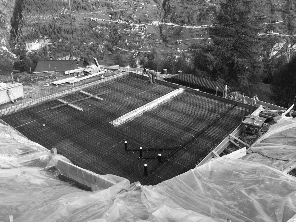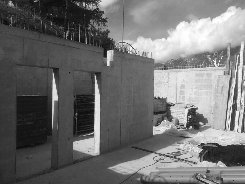 Untergeschoss (Parkhalle, Technik) aus Stahlbeton. Obergeschosse in Holzbau.