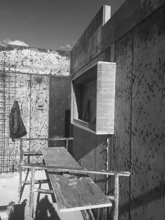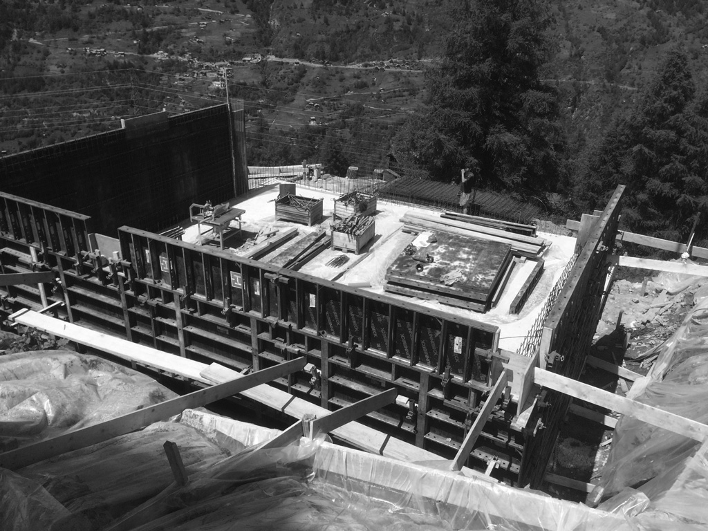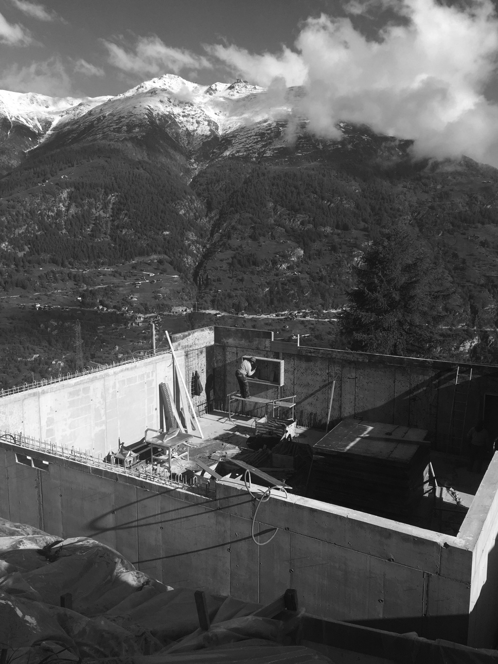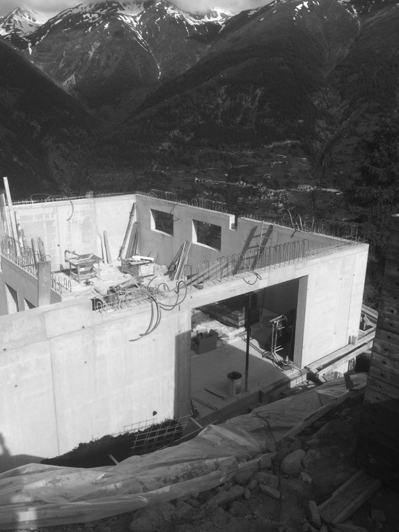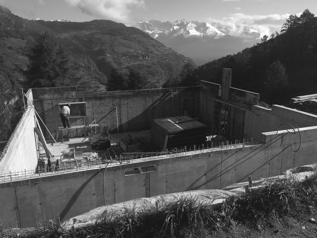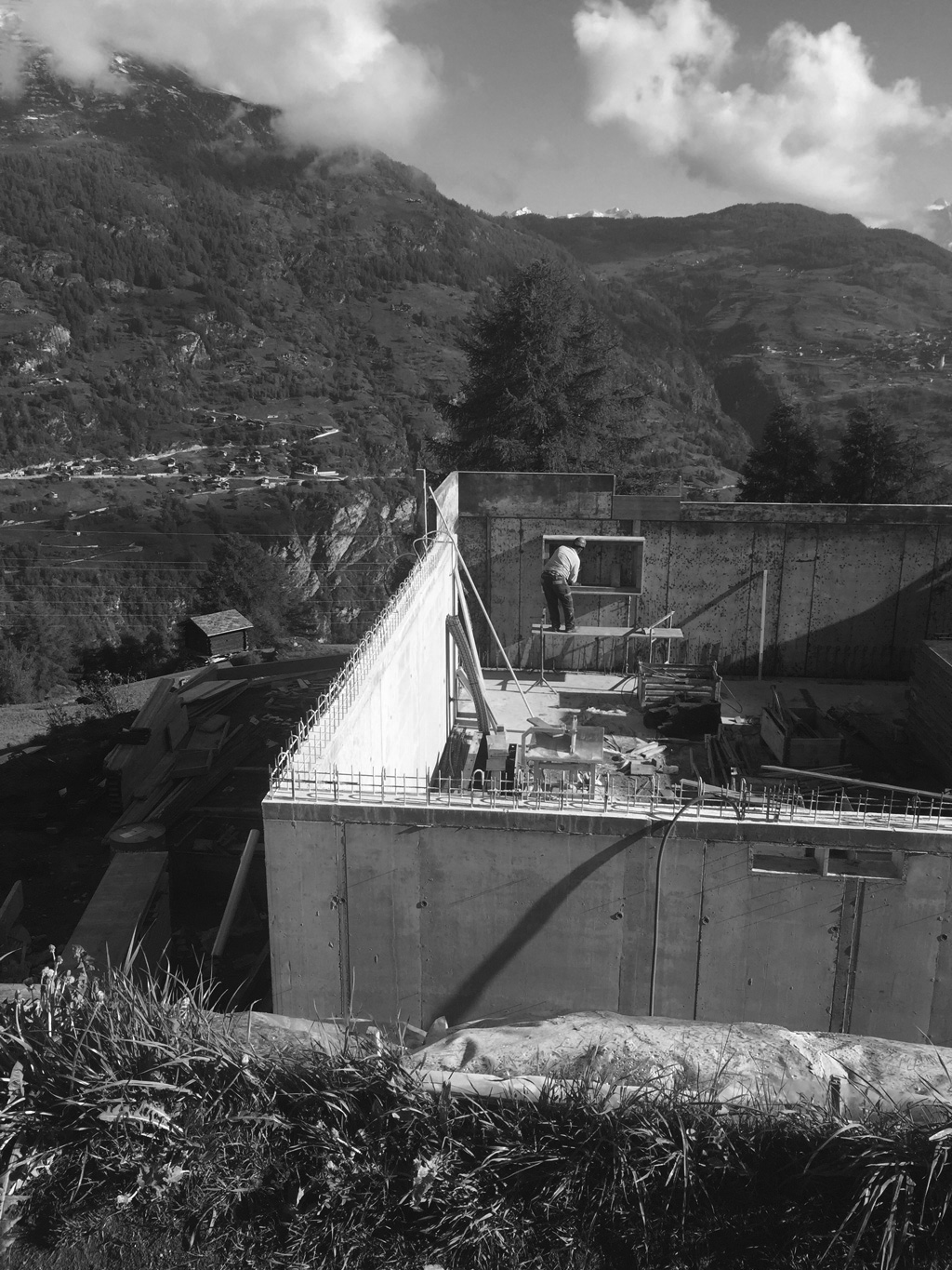 Untergeschoss (Parkhalle, Technik) aus Stahlbeton. Obergeschosse in Holzbau.